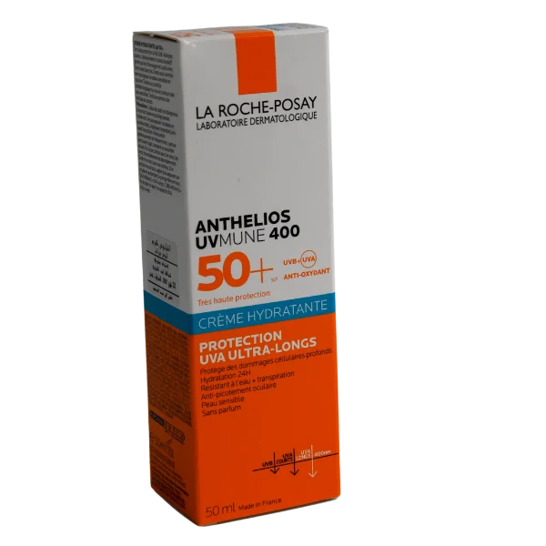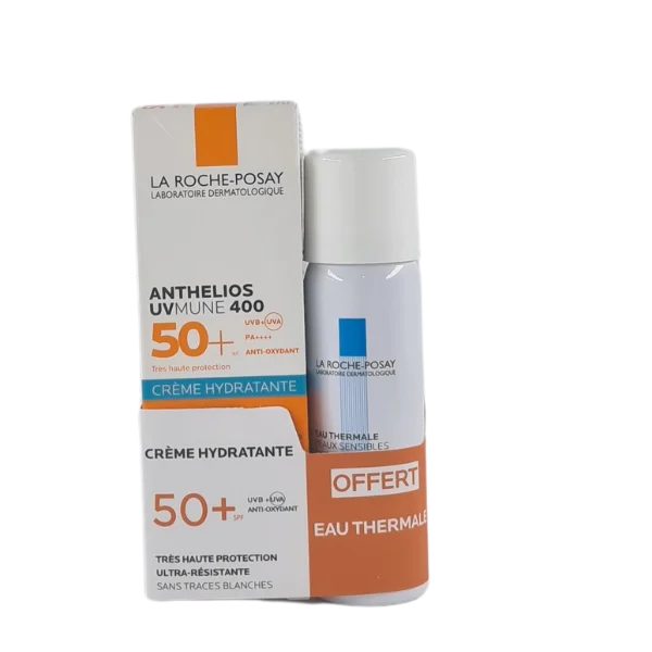 Anthelios UVMUNE 400 SPF50+ hydratant, très haute protection contre UVA, UVB et UVA ultra-longs, formulation sans parfum, texture fluide et légère, non grasse, résistante à l’eau et non comédogène, avec Eau Thermale La Roche-Posay 50 ml offerte pour apaiser et rafraîchir les peaux sensibles.