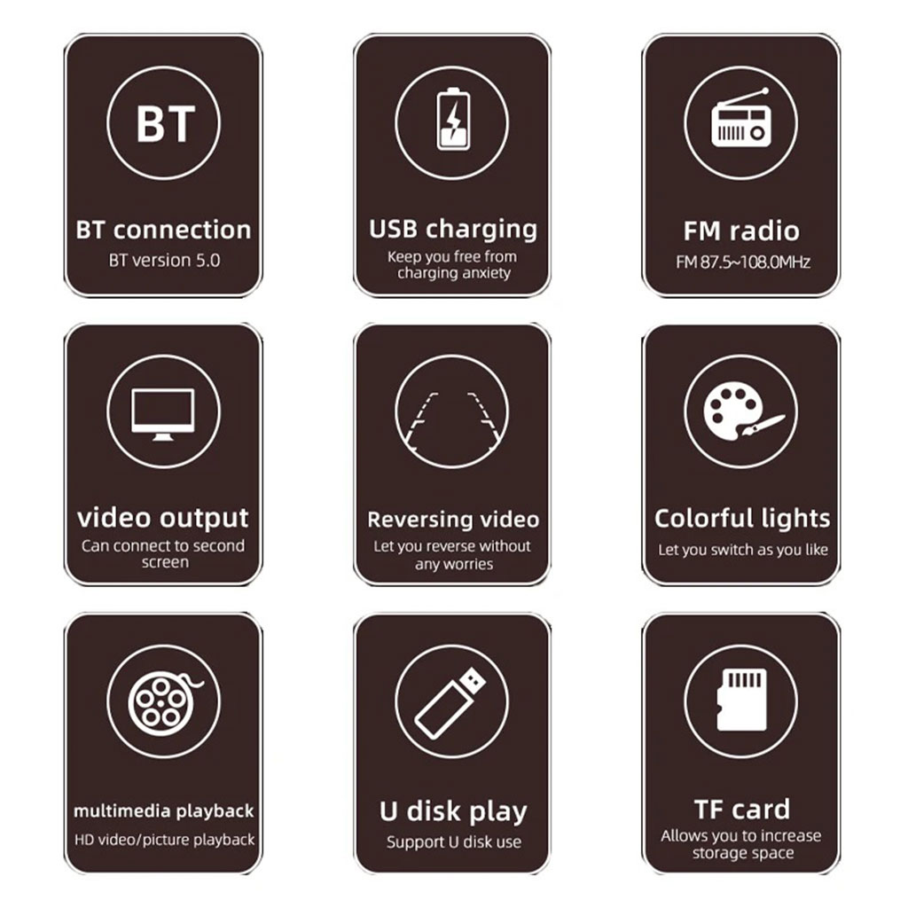 Livré avec un écran de 4,1 pouces. Vous pouvez regarder des vidéos, des photos. Avec l’interface DVR. Soutenir la voiture en inversant les images. Peut prendre une carte TF externe, un disque U. Ne vous inquiétez pas de la capacité de mémoire. Prise en charge de la connexion Bluetooth, de la radio FM et de la lecture multimédia multi-format. Facile à utiliser Chargement pratique via USB.