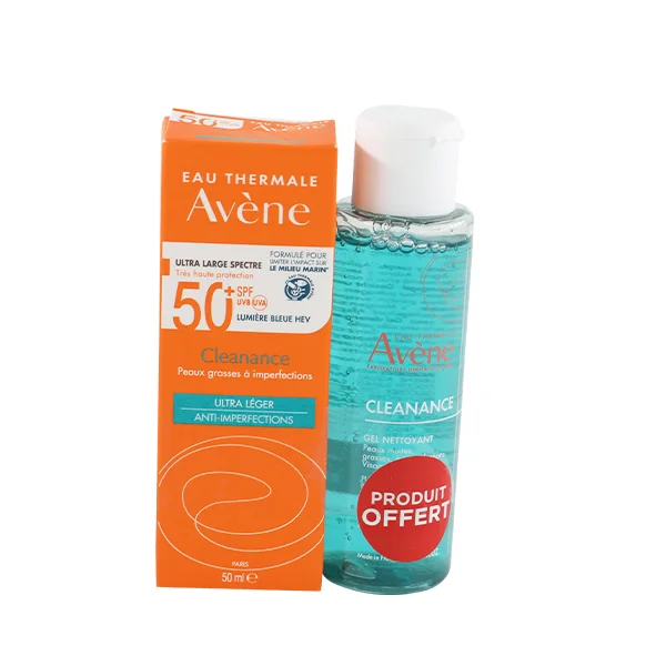 Avene cleanance offre une très haute protection solaire SPF50+ pour les peaux grasses à imperfections. Intègre le TriAsorB ™, filtre solaire breveté qui protège des UV et de la lumière bleue jusqu’à 450 nm + Avene cleanance gel nettoyant 100ml est un gel nettoyant purifiant, légèrement moussant, destiné aux peaux grasses et /ou à tendance acnéique.