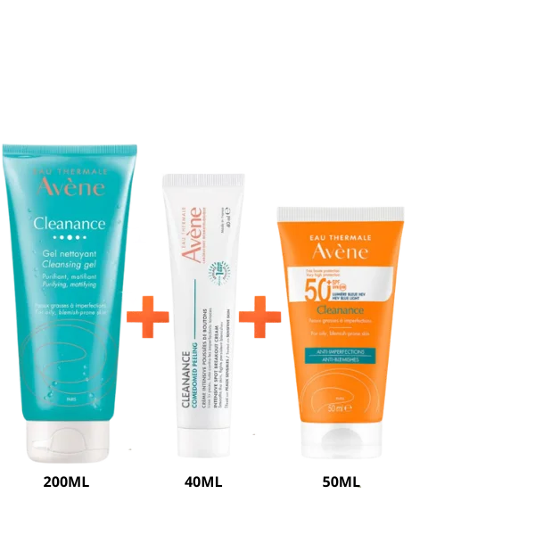 Le pack est compsé: Avéne cleanance gel nettoyant 200ml : purifie et matifie, élimine excès de sébum et impuretés Avéne cleanance comedomed peeling 40ml : réduit boutons et rougeurs, atténue les marques résiduelles Avéne cleanance ecran spf50+ 50ml : protège la peau du soleil, prévient nouvelles imperfections, fini non brillant