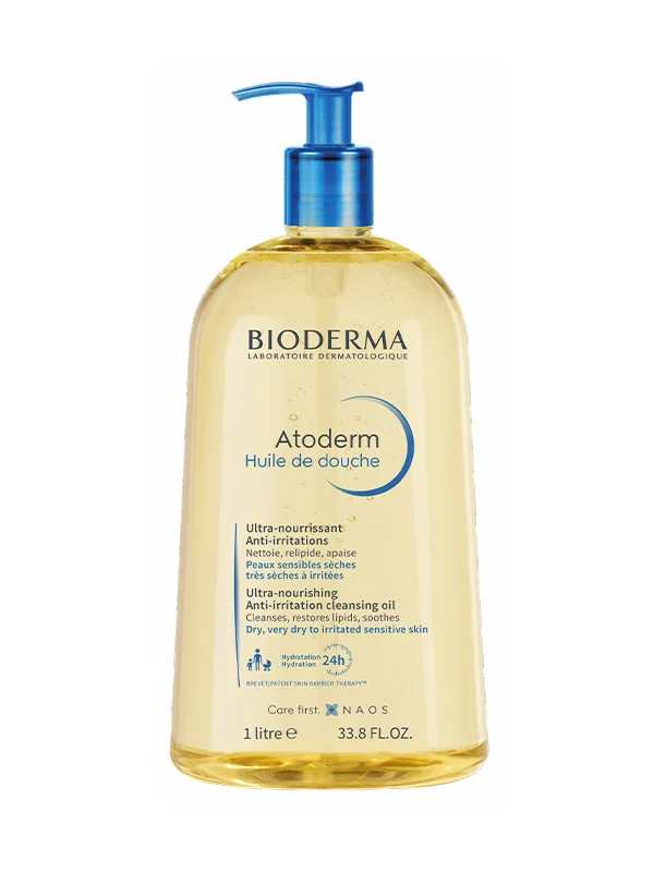 Atoderm Huile de douche nettoie en douceur. Sa formule exclusive composée d’agents relipidants (vitamine PP et biolopides végétaux) et hydratants nourrit intensément la peau, calme les sensations de tiraillement, et protège des agressions extérieures. Le complexe breveté Skin Barrier Therapy™ permet de limiter l’adhésion de certaines bactéries (staphylocoque doré) à la surface de la peau, qui peuvent être à l’origine de l’aggravation de la sécheresse cutanée.(1) et (2)