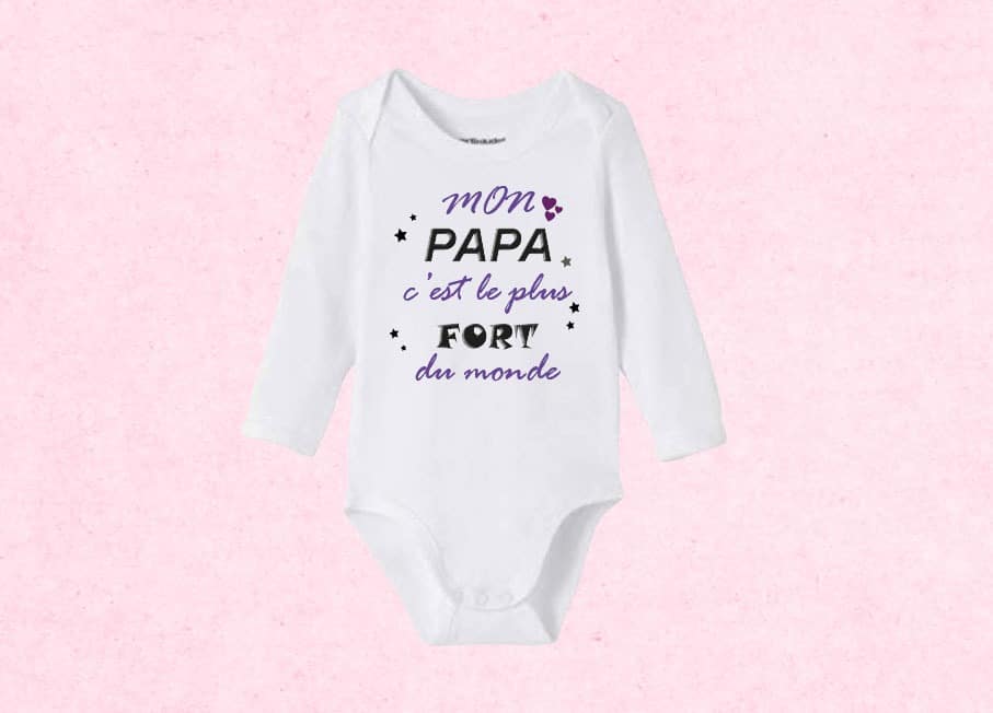 Le body personnalisé mon papa c’est le plus fort est à la fois un cadeau que votre bébé peut porter au quotidien, mais en plus avec votre touche personnelle ce sera un souvenir pour la vie. Le body personnalisé mon papa c’est le plus fort sera imprimé avec le design que vous avez imaginez pour bébé, son papa et sa maman. En plus, vous pouvez ajouter une photo, un texte ou un prénom.