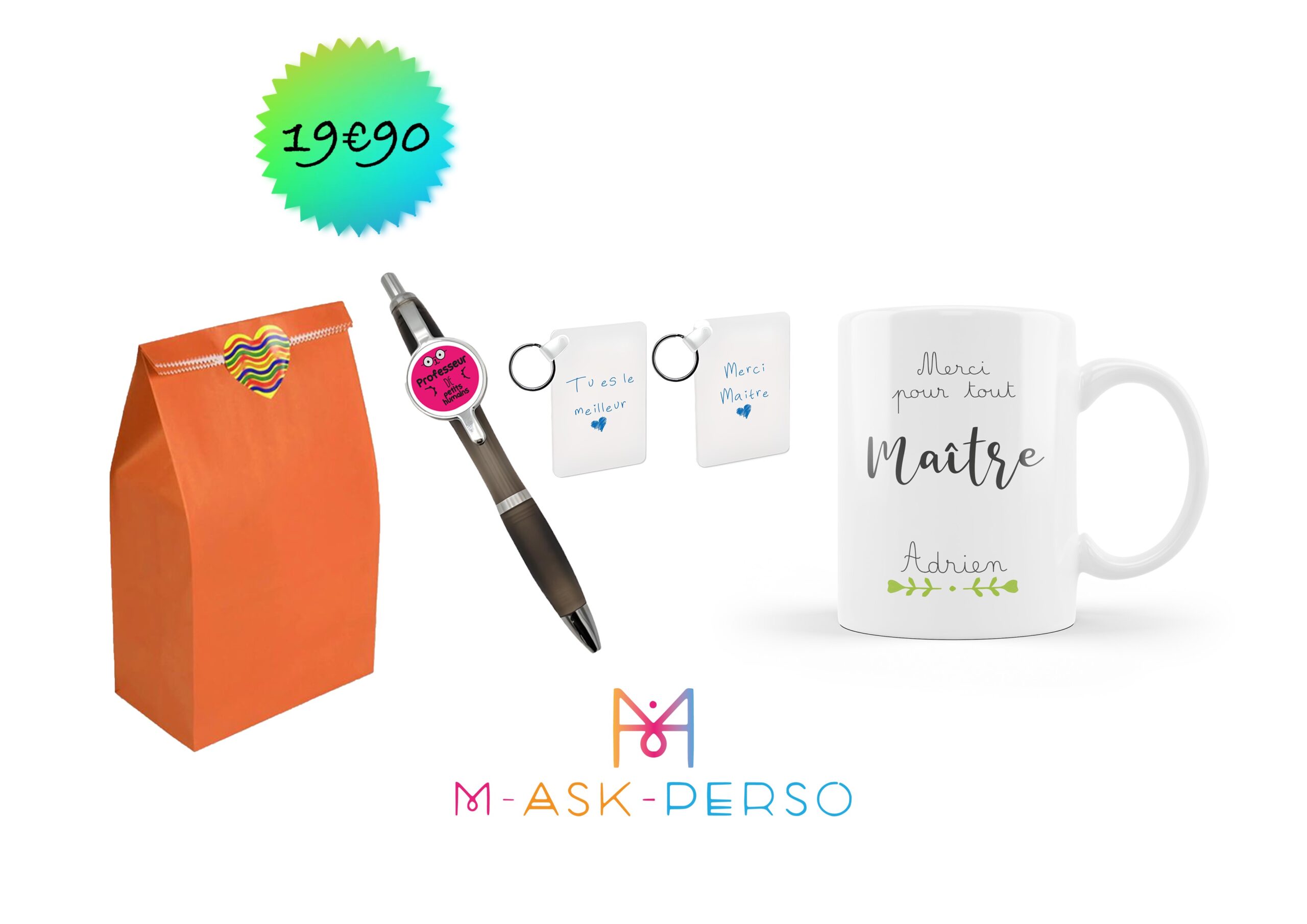 Cadeau personnalisé merci pour maître : Pack avec mug, stylo et porte-clés