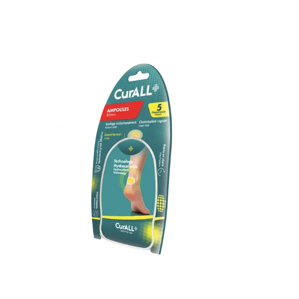 Pansements ampoules CURALL Large Talon : soulagement immédiat, protection optimale et cicatrisation accélérée. Invisibles, imperméables, idéals pour les zones sensibles du talon.
