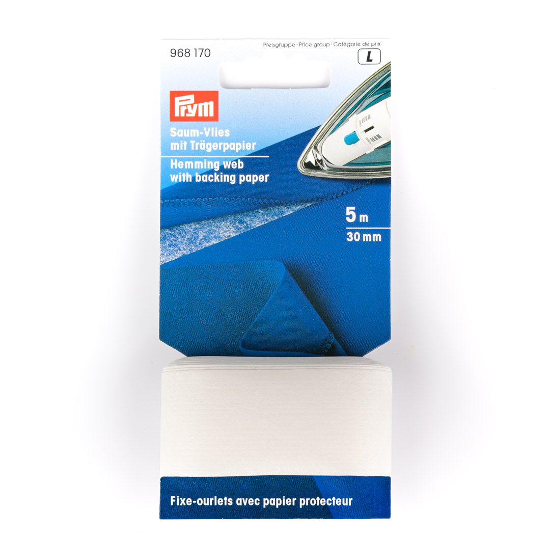 Fixe-ourlets avec papier protecteur Prym Longueur : 5m Largeur : 30mm Rapide et efficace : Faîtes vos ourlets en un tour de main avec le fixe-ourlets. Fixe les tissus grâce à la chaleur du fer à repasser. Pour ourlets de pantalons, robes, manteaux, sans couture. Marque : Prym.