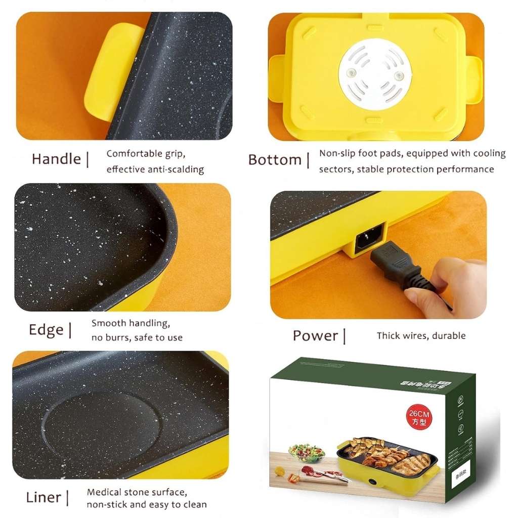 Surface de Cuisson : Plaque chauffante antiadhésive pour une cuisson sans ajout de matières grasses et un nettoyage facile. Contrôle de la Température : Thermostat réglable offrant plusieurs niveaux de chaleur pour s’adapter à divers types de cuisson. Polyvalence : Idéal pour préparer viandes, légumes, fruits de mer et autres plats teppanyaki à la maison. Design Compact : Conception adaptée à une utilisation en intérieur, parfaite pour les cuisines domestiques. Facilité d’Utilisation : Poignées isolantes et pieds antidérapants assurant une manipulation sécurisée et stable.