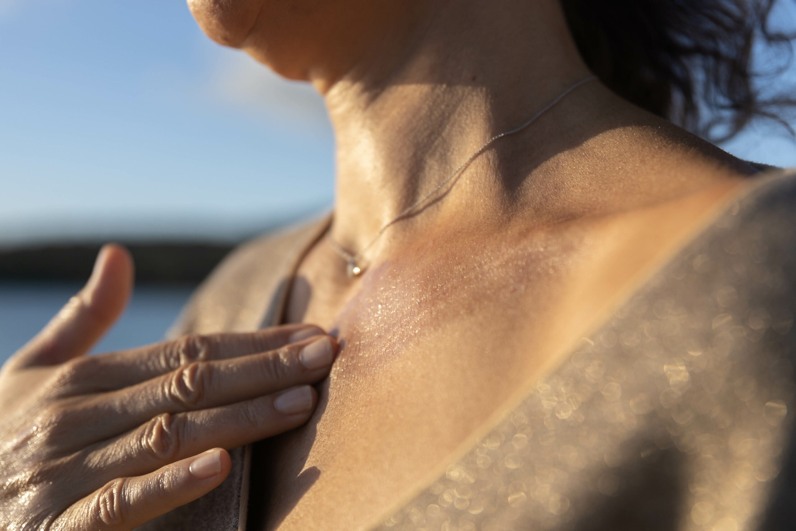Sur le corps, appliquez le roll on sur le décolleté , les épaules et toutes les zones exposées à la lumière pour un effet coup d’éclat