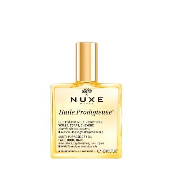 Nuxe Huile Prodigieuse Tunisie 100ml : Huile sèche 3-en-1, idéale pour le visage, le corps et les cheveux. Elle nourrit, répare et sublime la peau et les cheveux, offrant un éclat satiné et une protection contre les agressions extérieures.