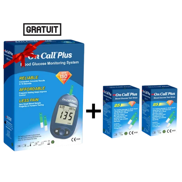 Le lot ON CALL PLUS comprend 100 bandelettes de test, un appareil gratuit, 10 lancettes gratuites et 10 bandes gratuites. Il offre une solution complète et économique pour la surveillance de la glycémie, idéal pour les personnes atteintes de diabète.