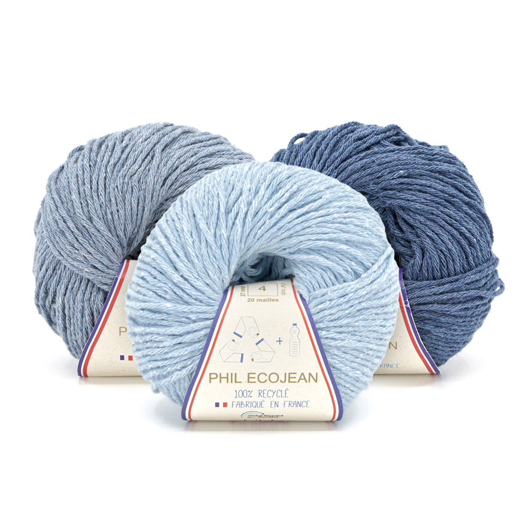 La gamme Phildar Phil Ecojean est fabriquée avec des fibres recyclées. Des jeans et des bouteilles plastiques sont recyclés de manière à obtenir du coton avec l’un et du Polyester avec l’autre.